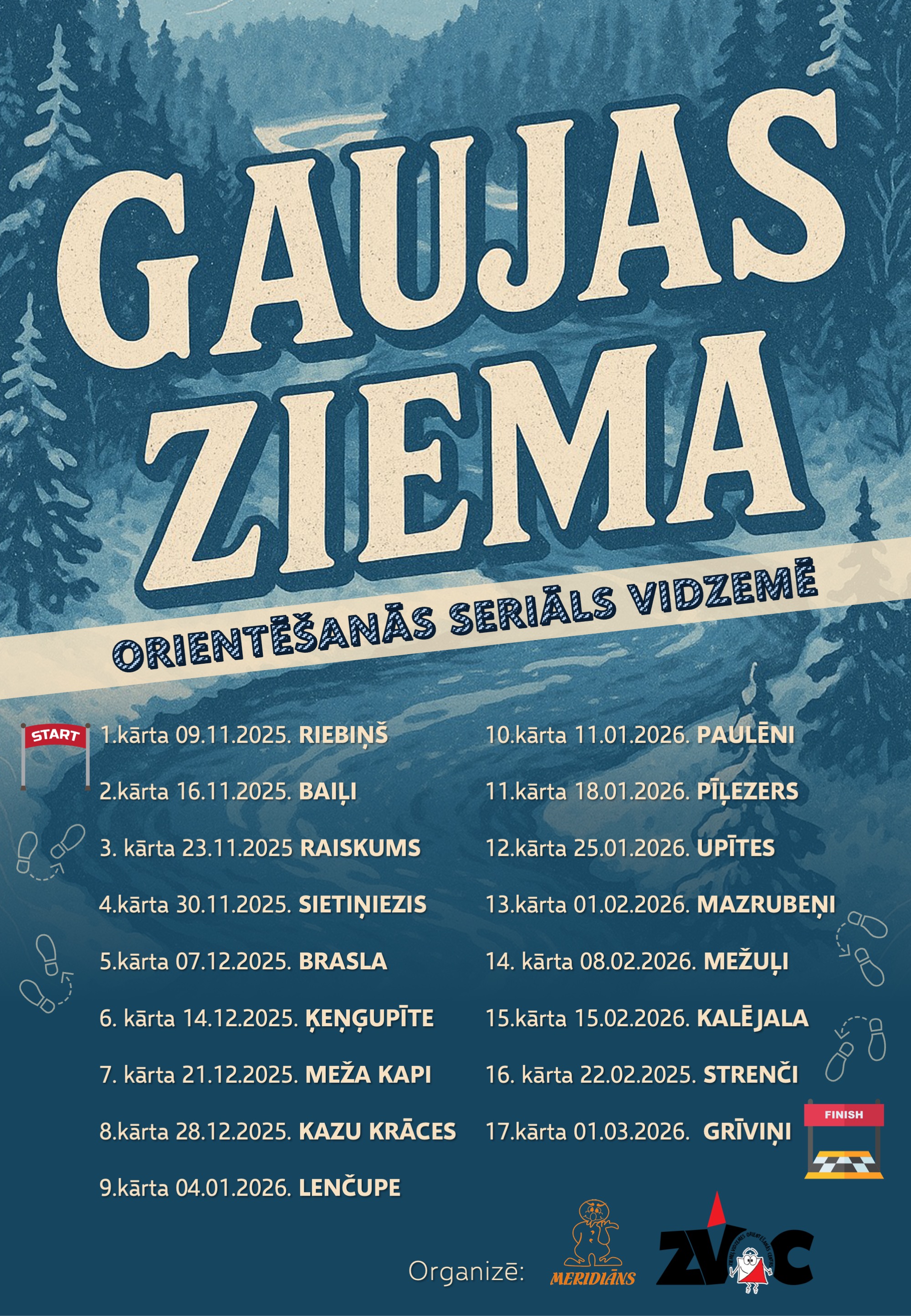 Orientēšanās Vidzemē turpināsies arī ziemā! OK Meridiāns sadarbībā ar mūsu Valmieras kaimiņiem - Ziemeļvidzemes orientēšanās centru, no 9.novembra līdz 1.martam katru svētdienu organizē orientēšanās seriālu "Gaujas Ziema 2025-2026". Vairāk nolikumā.